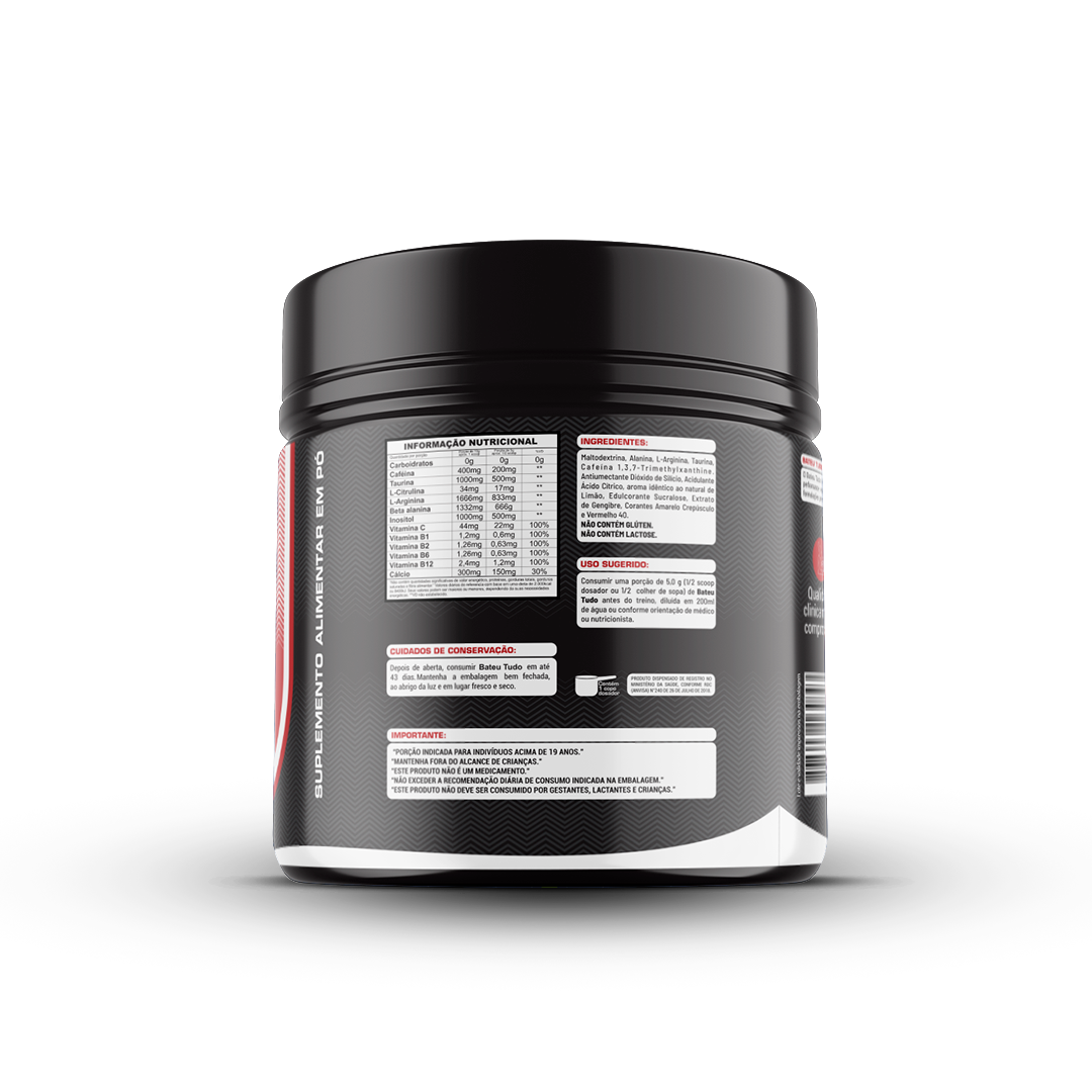 O "Bateu Tudo" é um suplemento alimentar pré-treino formulado para melhorar resistência e desempenho. Contém ingredientes como cafeína, beta-alanina, taurina e gengibre, que auxiliam na energia, foco e recuperação muscular, além de favorecer uma maior disposição durante os treinos intensos. É ideal para atletas e praticantes de atividades físicas que buscam um suplemento para potencializar seus resultados.